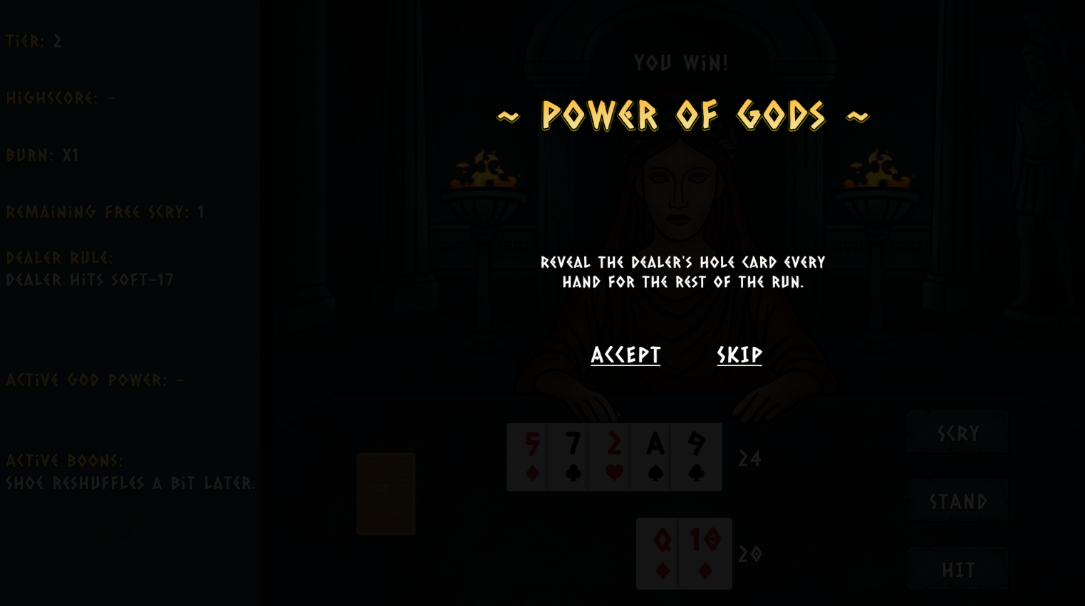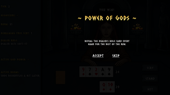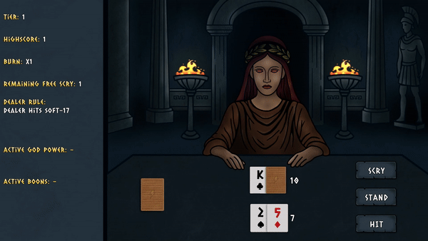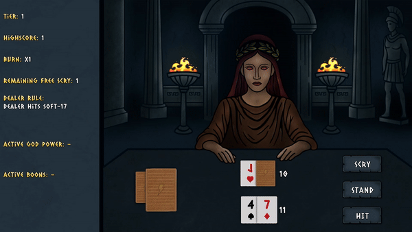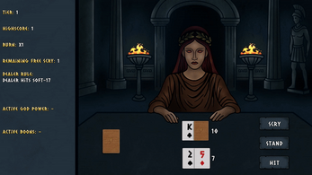 A lightning-fast roguelite take on blackjack. Win hands, pick boons, and occasionally accept a god’s bargain—Zeus may even reveal the dealer’s hole card. Build toward 21, manage the shoe, and push luck through short, punchy runs.