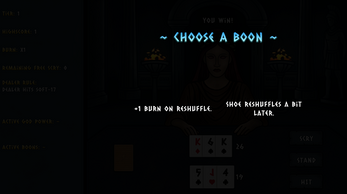 My only issue would be the auto lose from the dealers 21, which is understandable since it is blackjack. Maybe a saving grace mechanic or a life system that would continue the run and you would instead just lose 1 life but still gain the ability to pick an effect could work. Not just for that instance, butr for the general game.